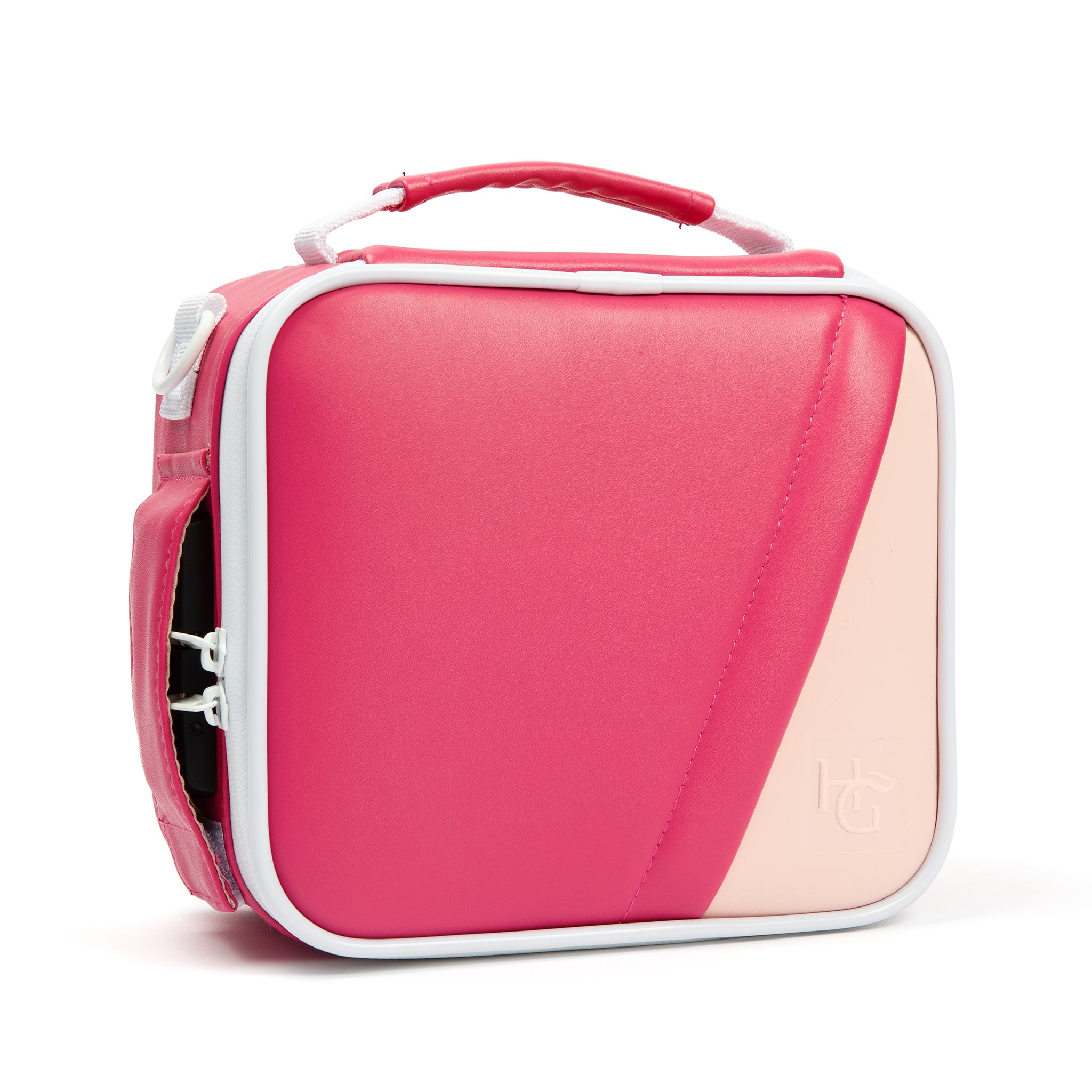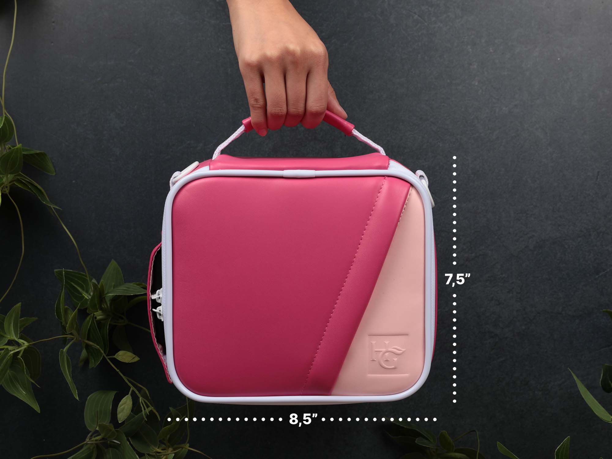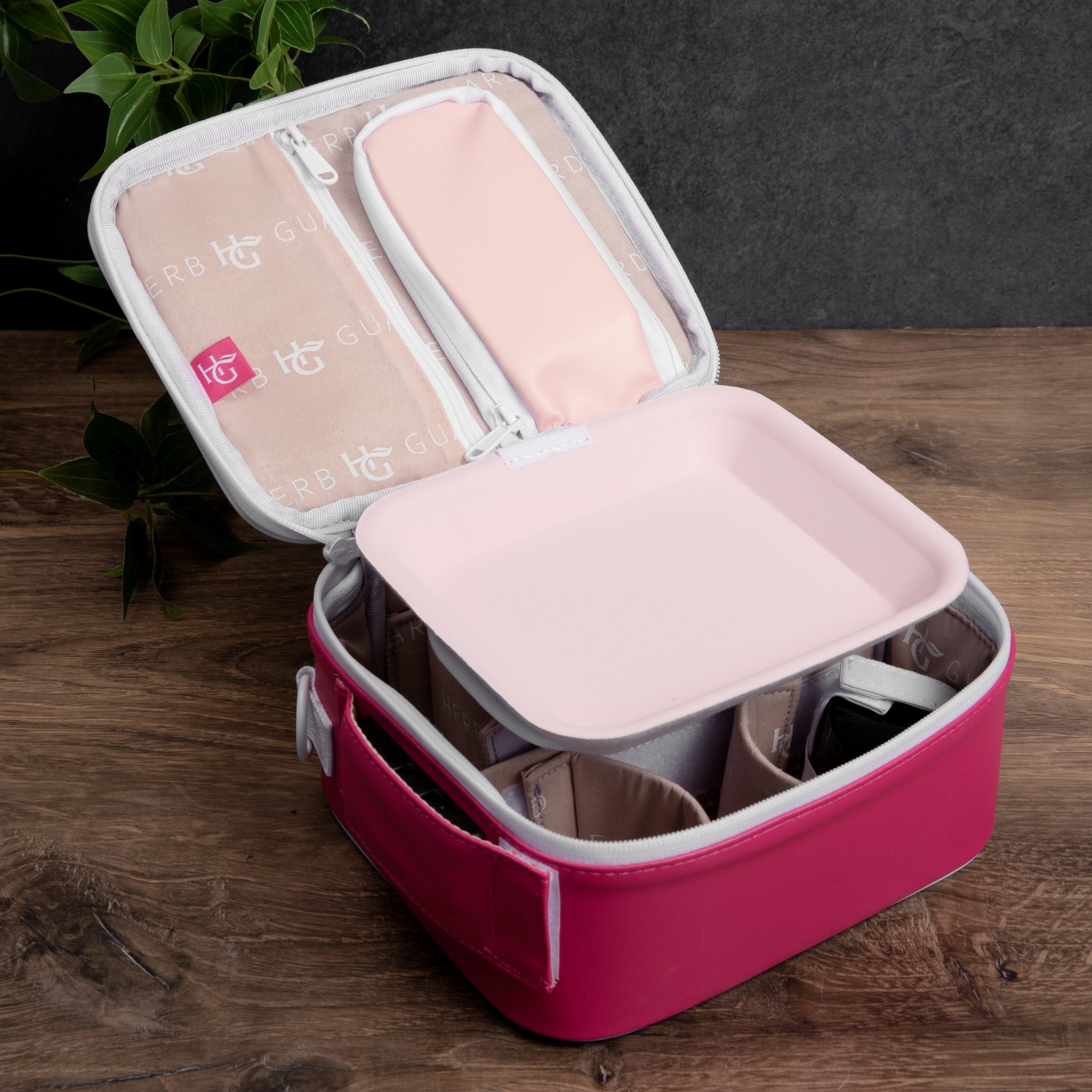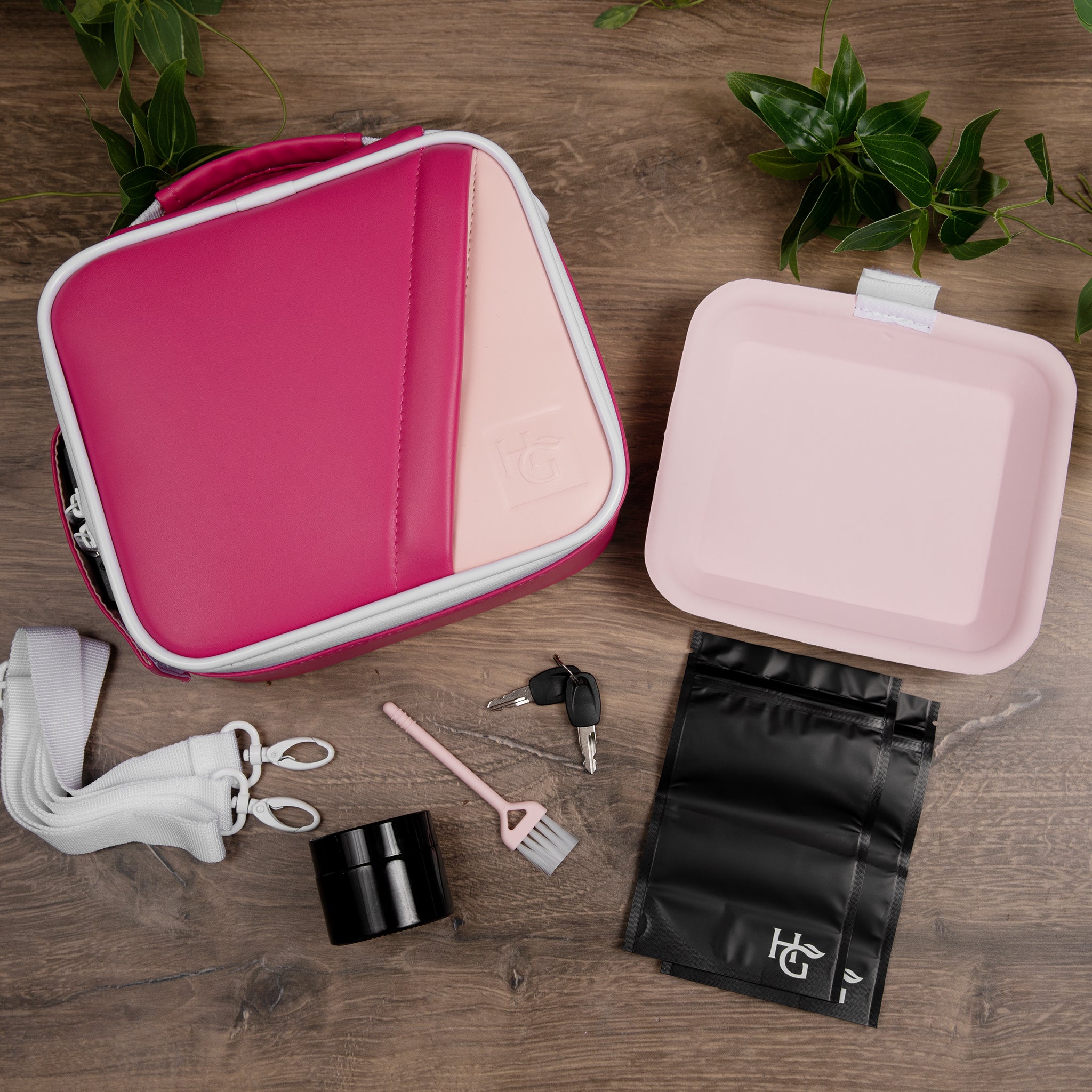 Each case includes a removable pink tray, pink brush, ultraviolet smell proof jar, mini pink brush to clean the tray, built in combo lock, travel bags and keys for the lock (in case you forget your combination).